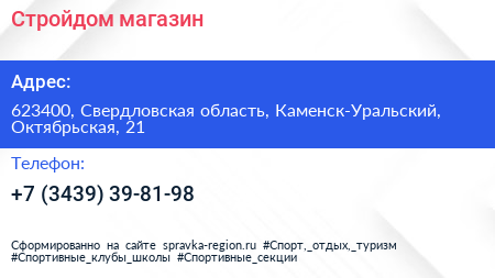 Стройдом, магазин по адресу 623400, Свердловская область, Каменск-Уральский, Октябрьская, 21 в дальнейшем Организация, размещена в следующих категориях: