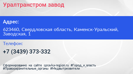 Уралтранстром, завод по адресу 623460, Свердловская область, Каменск-Уральский, Заводская, 1 в дальнейшем Организация, размещена в следующих категориях: