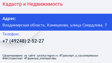 Кадастр и Недвижимость по адресу Владимирская область, Камешково, улица Свердлова, 7 в дальнейшем Организация, размещена в следующих категориях: