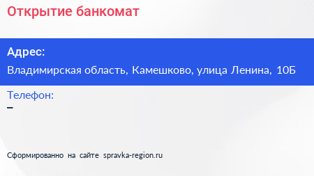 Открытие, банкомат по адресу Владимирская область, Камешково, улица Ленина, 10Б в дальнейшем Организация, размещена в следующих категориях: