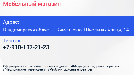 Мебельный магазин по адресу Владимирская область, Камешково, Школьная улица, 14 в дальнейшем Организация, размещена в следующих категориях: