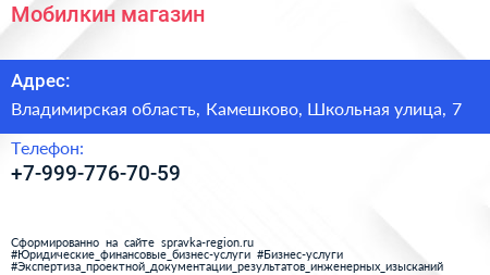 Мобилкин, магазин по адресу Владимирская область, Камешково, Школьная улица, 7 в дальнейшем Организация, размещена в следующих категориях: