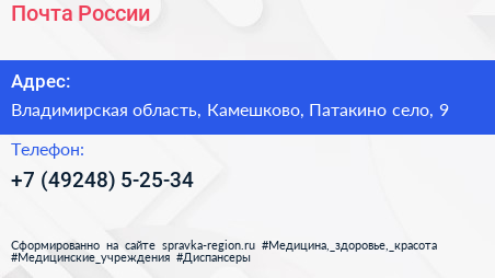 Почта России по адресу Владимирская область, Камешково, Патакино село, 9 в дальнейшем Организация, размещена в следующих категориях: