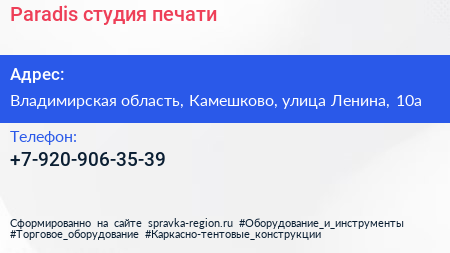 Paradis, студия печати по адресу Владимирская область, Камешково, улица Ленина, 10а в дальнейшем Организация, размещена в следующих категориях: