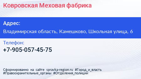 Ковровская Меховая фабрика по адресу Владимирская область, Камешково, Школьная улица, 6 в дальнейшем Организация, размещена в следующих категориях: