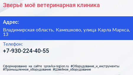 Зверьё моё, ветеринарная клиника по адресу Владимирская область, Камешково, улица Карла Маркса, 13 в дальнейшем Организация, размещена в следующих категориях:
