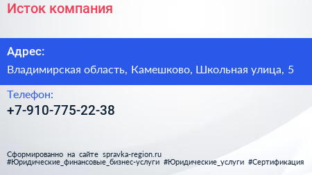Исток, компания по адресу Владимирская область, Камешково, Школьная улица, 5 в дальнейшем Организация, размещена в следующих категориях: