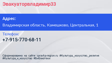 Эвакуаторвладимир33 по адресу Владимирская область, Камешково, Центральная, 1 в дальнейшем Организация, размещена в следующих категориях: