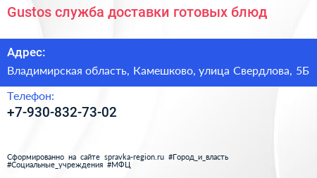 Gustos, служба доставки готовых блюд по адресу Владимирская область, Камешково, улица Свердлова, 5Б в дальнейшем Организация, размещена в следующих категориях:
