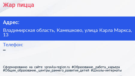 Жар-пицца по адресу Владимирская область, Камешково, улица Карла Маркса, 13 в дальнейшем Организация, размещена в следующих категориях: