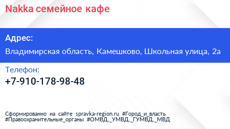 Nakka, семейное кафе по адресу Владимирская область, Камешково, Школьная улица, 2а в дальнейшем Организация, размещена в следующих категориях:
