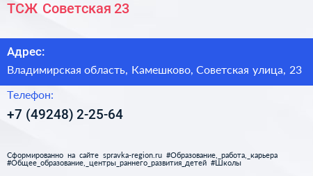 ТСЖ Советская-23 по адресу Владимирская область, Камешково, Советская улица, 23 в дальнейшем Организация, размещена в следующих категориях: