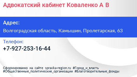 Адвокатский кабинет Коваленко А.В. по адресу Волгоградская область, Камышин, Пролетарская, 63 в дальнейшем Организация, размещена в следующих категориях: