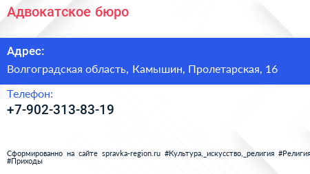 Адвокатское бюро по адресу Волгоградская область, Камышин, Пролетарская, 16 в дальнейшем Организация, размещена в следующих категориях: