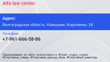 Alfa law center по адресу Волгоградская область, Камышин, Короленко, 18 в дальнейшем Организация, размещена в следующих категориях: