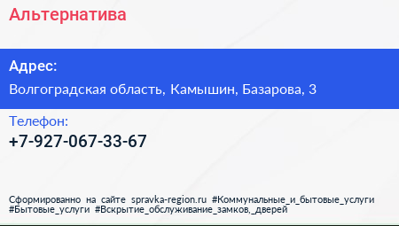 Альтернатива по адресу Волгоградская область, Камышин, Базарова, 3 в дальнейшем Организация, размещена в следующих категориях: