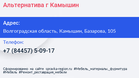 Альтернатива, г. Камышин по адресу Волгоградская область, Камышин, Базарова, 105 в дальнейшем Организация, размещена в следующих категориях: