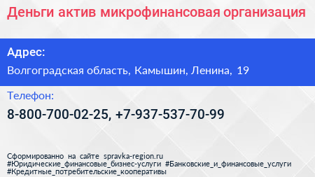 Деньги актив, микрофинансовая организация по адресу Волгоградская область, Камышин, Ленина, 19 в дальнейшем Организация, размещена в следующих категориях: