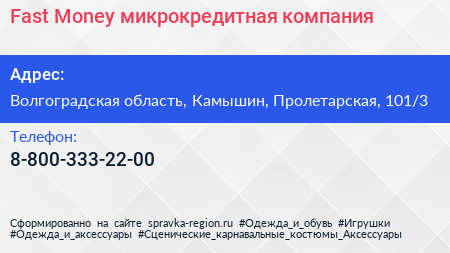 Fast Money, микрокредитная компания по адресу Волгоградская область, Камышин, Пролетарская, 101/3 в дальнейшем Организация, размещена в следующих категориях:
