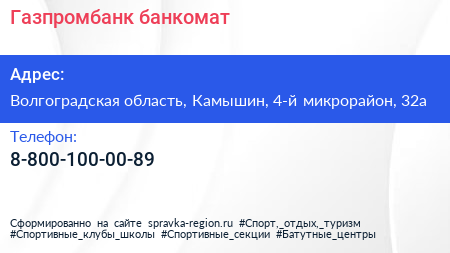 Газпромбанк, банкомат по адресу Волгоградская область, Камышин, 4-й микрорайон, 32а в дальнейшем Организация, размещена в следующих категориях: