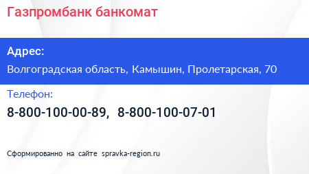 Газпромбанк, банкомат по адресу Волгоградская область, Камышин, Пролетарская, 70 в дальнейшем Организация, размещена в следующих категориях: