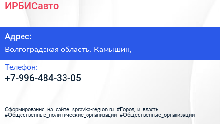 ИРБИСавто по адресу Волгоградская область, Камышин, в дальнейшем Организация, размещена в следующих категориях: