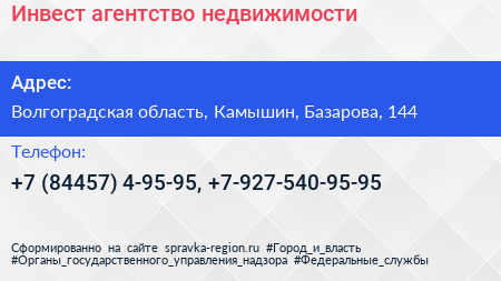 Инвест, агентство недвижимости по адресу Волгоградская область, Камышин, Базарова, 144 в дальнейшем Организация, размещена в следующих категориях: