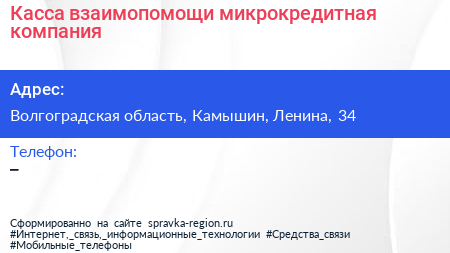 Касса взаимопомощи, микрокредитная компания по адресу Волгоградская область, Камышин, Ленина, 34 в дальнейшем Организация, размещена в следующих категориях: