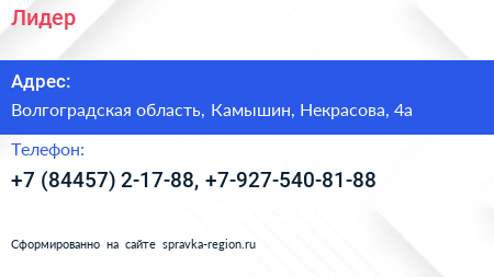 Лидер по адресу Волгоградская область, Камышин, Некрасова, 4а в дальнейшем Организация, размещена в следующих категориях: