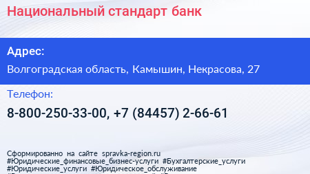 Национальный стандарт, банк по адресу Волгоградская область, Камышин, Некрасова, 27 в дальнейшем Организация, размещена в следующих категориях: