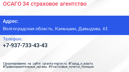 ОСАГО 34, страховое агентство по адресу Волгоградская область, Камышин, Давыдова, 61 в дальнейшем Организация, размещена в следующих категориях: