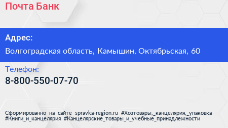 Почта Банк по адресу Волгоградская область, Камышин, Октябрьская, 60 в дальнейшем Организация, размещена в следующих категориях: