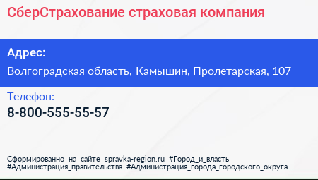 СберСтрахование, страховая компания по адресу Волгоградская область, Камышин, Пролетарская, 107 в дальнейшем Организация, размещена в следующих категориях: