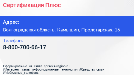 Сертификация Плюс по адресу Волгоградская область, Камышин, Пролетарская, 16 в дальнейшем Организация, размещена в следующих категориях: