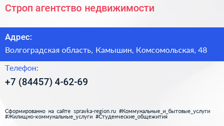 Строп, агентство недвижимости по адресу Волгоградская область, Камышин, Комсомольская, 48 в дальнейшем Организация, размещена в следующих категориях: