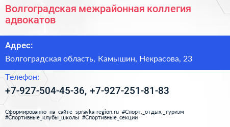 Волгоградская межрайонная коллегия адвокатов по адресу Волгоградская область, Камышин, Некрасова, 23 в дальнейшем Организация, размещена в следующих категориях: