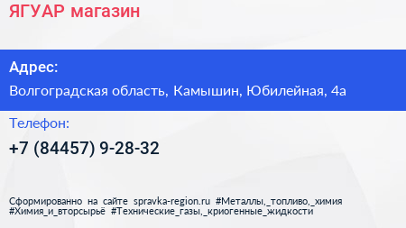 ЯГУАР, магазин по адресу Волгоградская область, Камышин, Юбилейная, 4а в дальнейшем Организация, размещена в следующих категориях:
