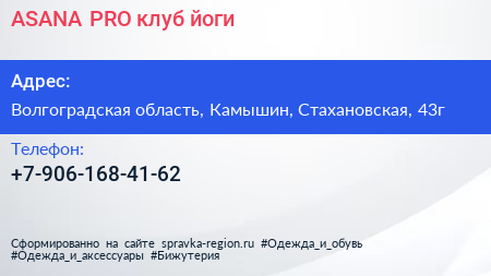 ASANA. PRO, клуб йоги по адресу Волгоградская область, Камышин, Стахановская, 43г в дальнейшем Организация, размещена в следующих категориях: