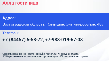 Алла, гостиница по адресу Волгоградская область, Камышин, 5-й микрорайон, 48а в дальнейшем Организация, размещена в следующих категориях: