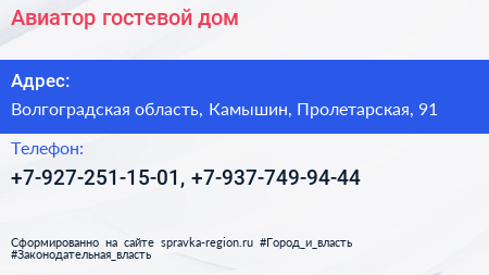 Авиатор, гостевой дом по адресу Волгоградская область, Камышин, Пролетарская, 91 в дальнейшем Организация, размещена в следующих категориях: