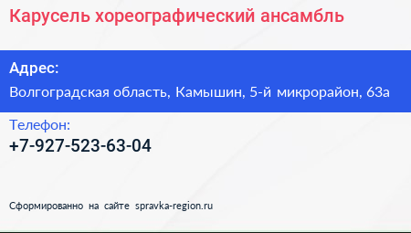 Карусель, хореографический ансамбль по адресу Волгоградская область, Камышин, 5-й микрорайон, 63а в дальнейшем Организация, размещена в следующих категориях: