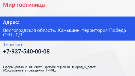 Мир, гостиница по адресу Волгоградская область, Камышин, территория Победа СНТ, 1/1 в дальнейшем Организация, размещена в следующих категориях: