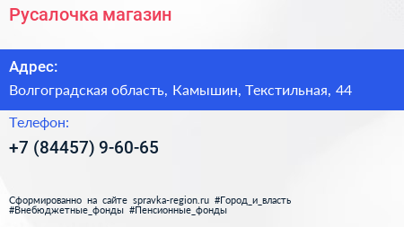 Русалочка, магазин по адресу Волгоградская область, Камышин, Текстильная, 44 в дальнейшем Организация, размещена в следующих категориях: