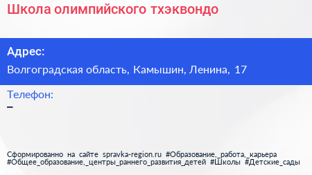 Школа олимпийского тхэквондо по адресу Волгоградская область, Камышин, Ленина, 17 в дальнейшем Организация, размещена в следующих категориях: