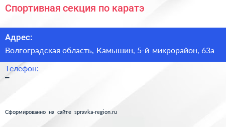 Спортивная секция по каратэ по адресу Волгоградская область, Камышин, 5-й микрорайон, 63а в дальнейшем Организация, размещена в следующих категориях: