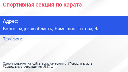 Спортивная секция по каратэ по адресу Волгоградская область, Камышин, Титова, 4а в дальнейшем Организация, размещена в следующих категориях: