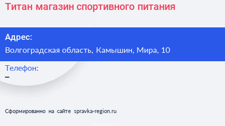 Титан, магазин спортивного питания по адресу Волгоградская область, Камышин, Мира, 10 в дальнейшем Организация, размещена в следующих категориях: