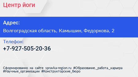 Центр йоги по адресу Волгоградская область, Камышин, Федоркова, 2 в дальнейшем Организация, размещена в следующих категориях: