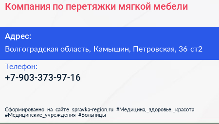 Компания по перетяжки мягкой мебели по адресу Волгоградская область, Камышин, Петровская, 36 ст2 в дальнейшем Организация, размещена в следующих категориях: