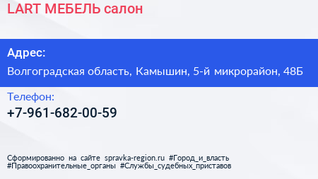 LART & МЕБЕЛЬ, салон по адресу Волгоградская область, Камышин, 5-й микрорайон, 48Б в дальнейшем Организация, размещена в следующих категориях: